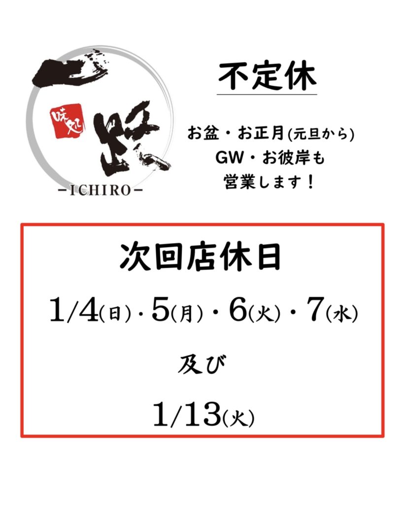 次回店休日 1月13日(火)